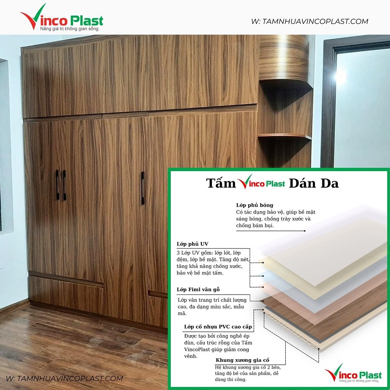 • Tấm nhựa Vincoplast là sản phẩm được tối ưu về mặt cấu trúc, với 2 lớp dày và tăng cường ở các vị trí bản lề giúp cho việc thiết kế thi công mọi sản phẩm nội thất đều dễ dàng, tiết kiệm chi phí.