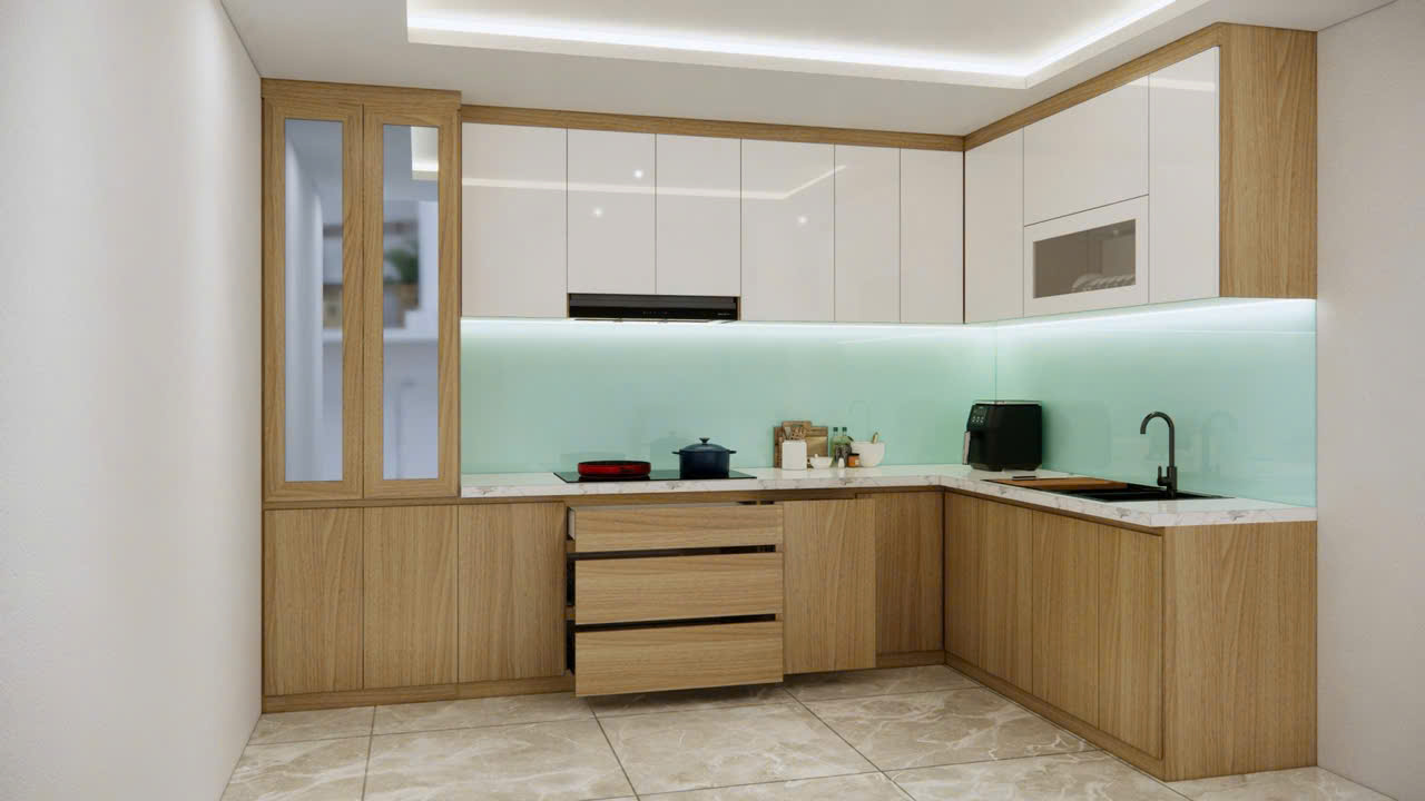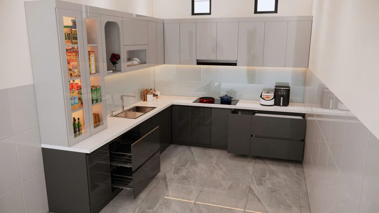 Tủ bếp chữ L với thiết kế linh hoạt, người dùng có thể phân chia tủ bếp thành các khu vực sử dụng với mục đích khác nhau