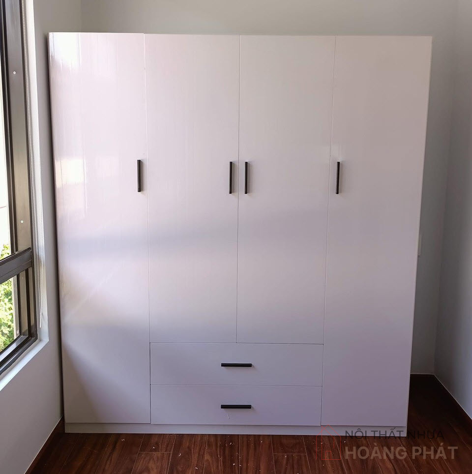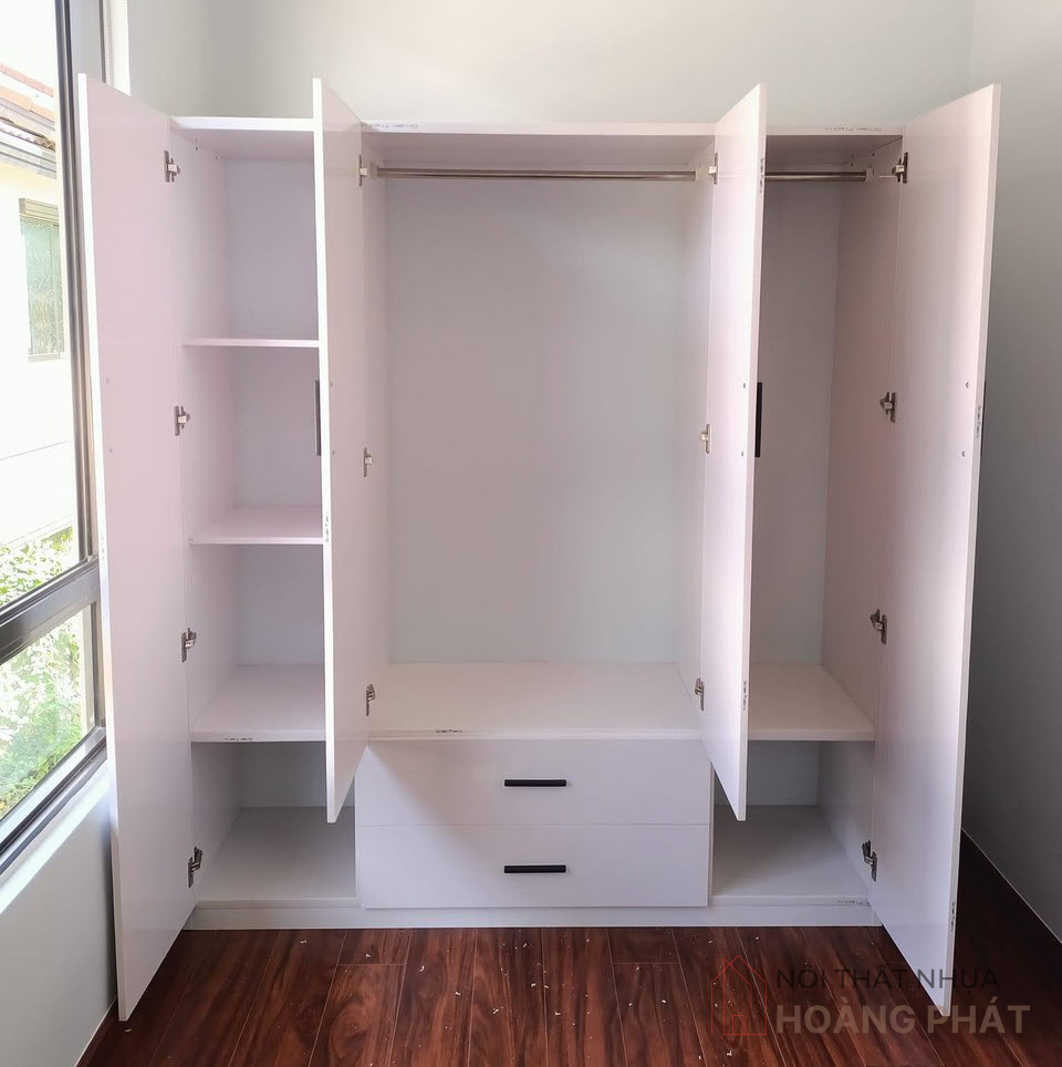 • Tiện ích: Tủ chia làm 4 cánh, 2 hộc kéo. thiết kế bên trong tùy chọn theo ý thích. tay nắm inox cao cấp